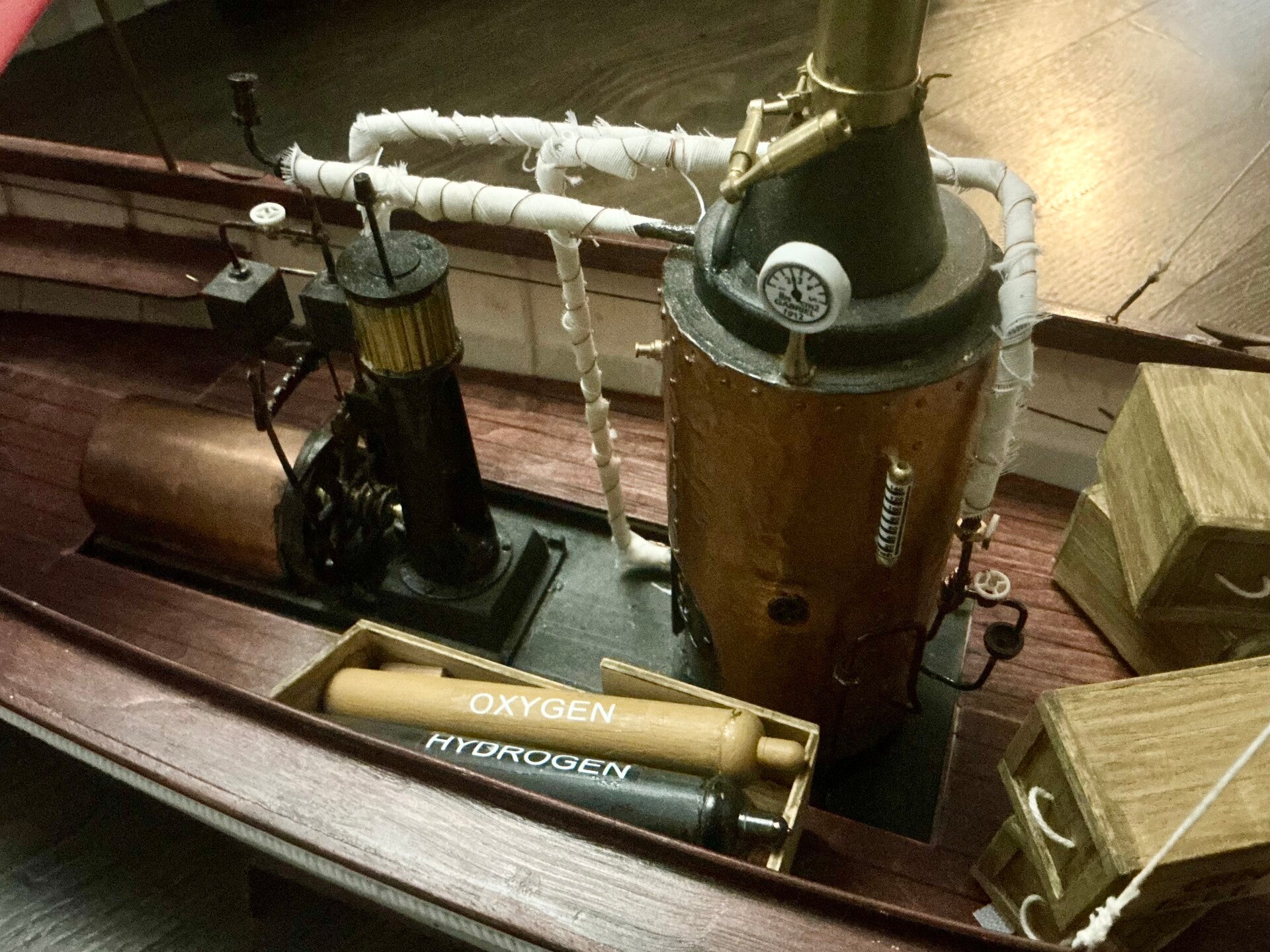 This boat is electric powered. The steam plant is for show only. Just needs battery and receiver.